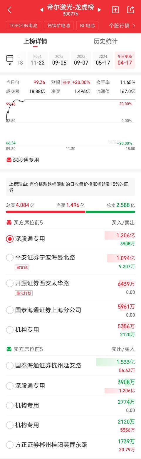 4月17日,帝尔激光(300776.SZ)因日涨幅达到20.00%登上往复所往复公开信息榜单。该股当日收盘报99.36元,全天成交额18.88亿元,换手率11.65%。